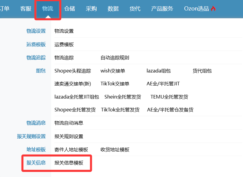 答:在【物流】-【报关信息模板】里面添加,如下图