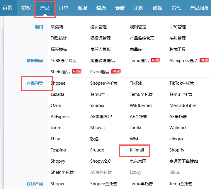 路径:【产品】-【产品刊登】-【kilimall】进入kilimall产品刊登页面