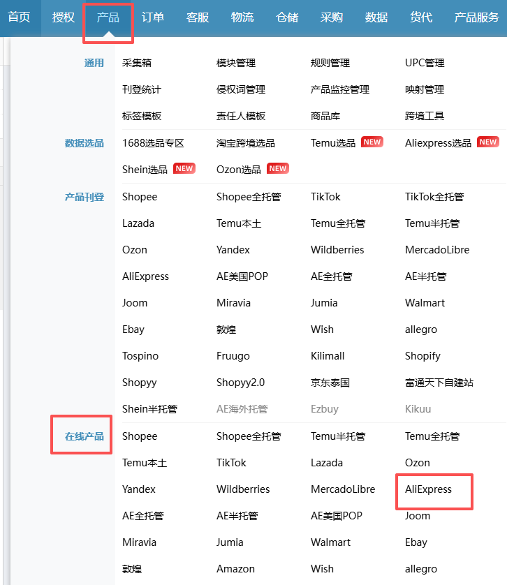 - 支持将在线产品复制到速卖通其他店铺、lazada、wish、ebay等