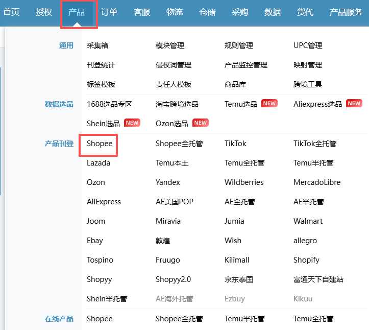 4. 从【产品】-【产品刊登】-【Shopee】也可以进入Shopee草稿箱,在草稿箱对产品进行编辑