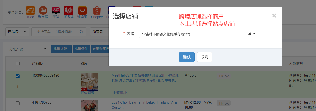 2 .采集过来的商品需认领到【shopee】,认领的时候需进行店铺名称的选择:跨境店铺选择商户名称,非跨境店铺选择店铺名称(芒果这边优先展示店铺别名-可前往店铺授权界面查看)