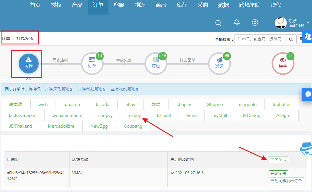 第2步:物流设置完成后,点击进入订单【打包发货】环节,同步订单,将店铺后台待发货订单同步到芒果。如下图