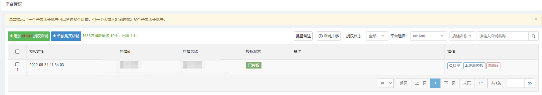 授权列表有1688店铺,即为授权成功。授权成功后,可以使用新版的1688采集。