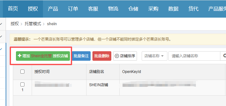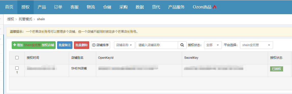 登录成功,芒果授权页面就会展示店铺,即绑定成功