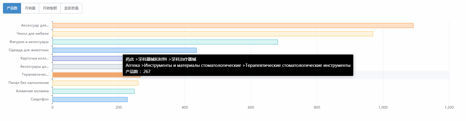 按产品数,销量,销售额,卖家数量四个维度分别展示中国专区排名前10的子类目,鼠标移入可查看对应的指标。复制类目名称,可在产品列表搜索当前类目下的产品,了解产品价格,销量等数据。