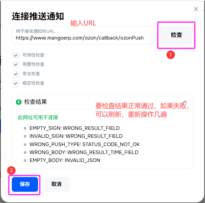 单击“检查”。Ozon将发送一个请求来检查连接,您的服务应对此做出响应。如果已建立连接,则会出现消息“此 URL 可用于连接”。