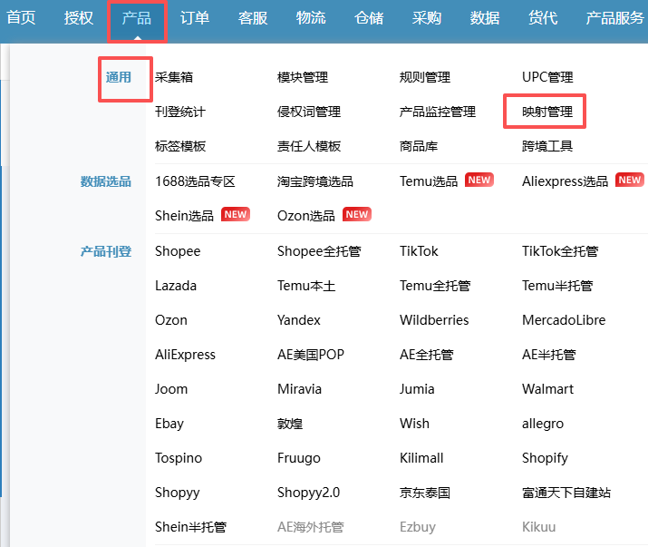 第一步:在芒果店长【产品】-->【通用】-->【映射管理】中,进行映射设置,包含类目映射,变体名映射,属性翻译映射。
