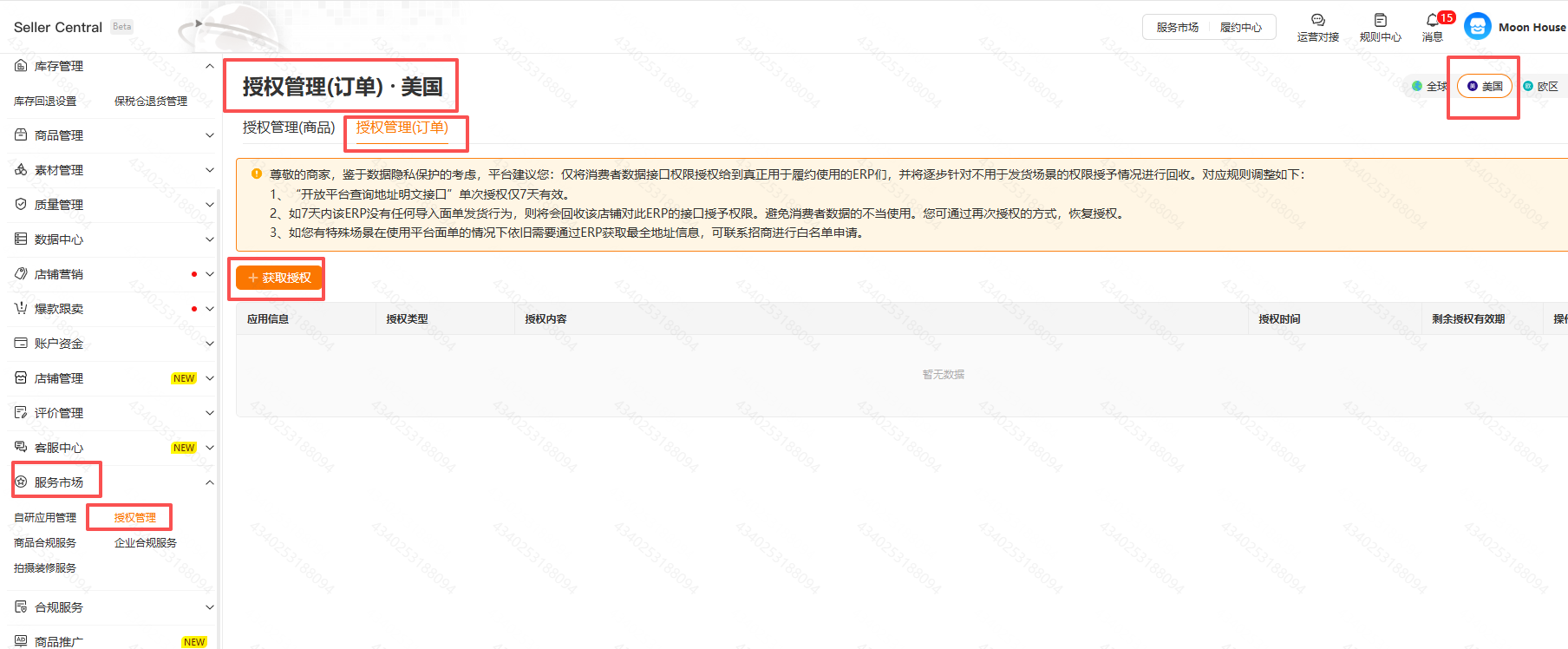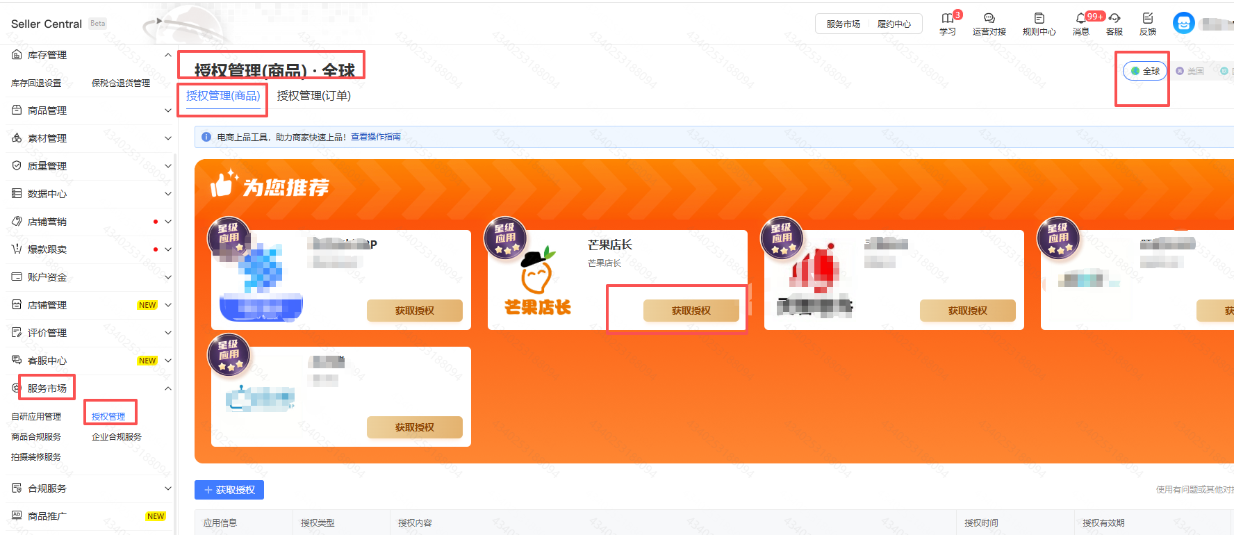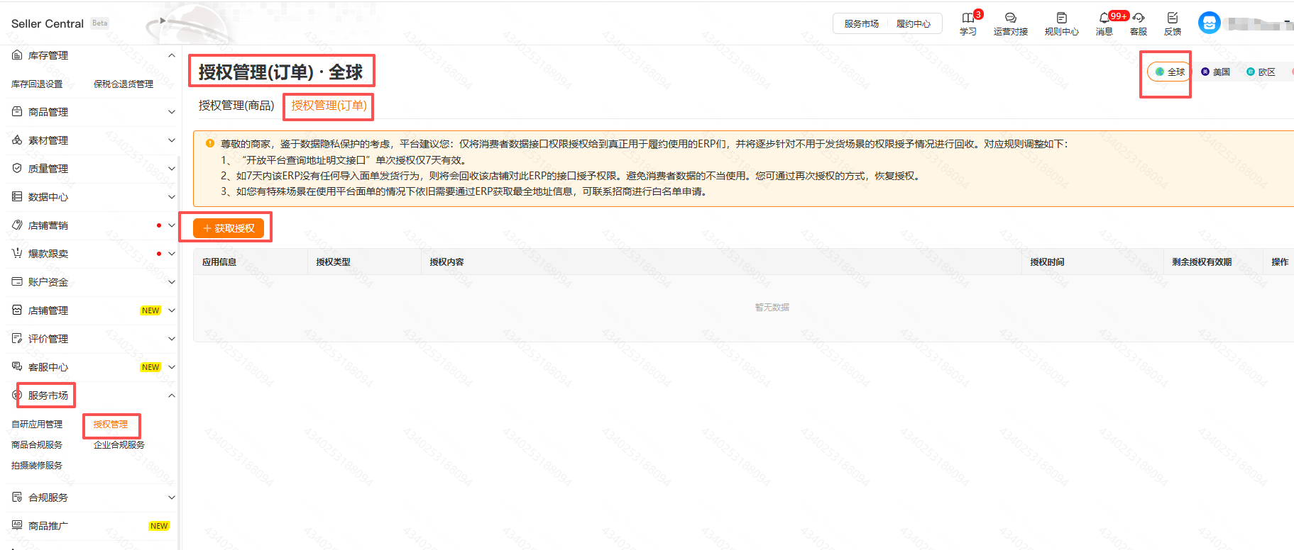 2.若需要查看在线产品合规信息的话,则必需要授权【“全球”订单access Token】