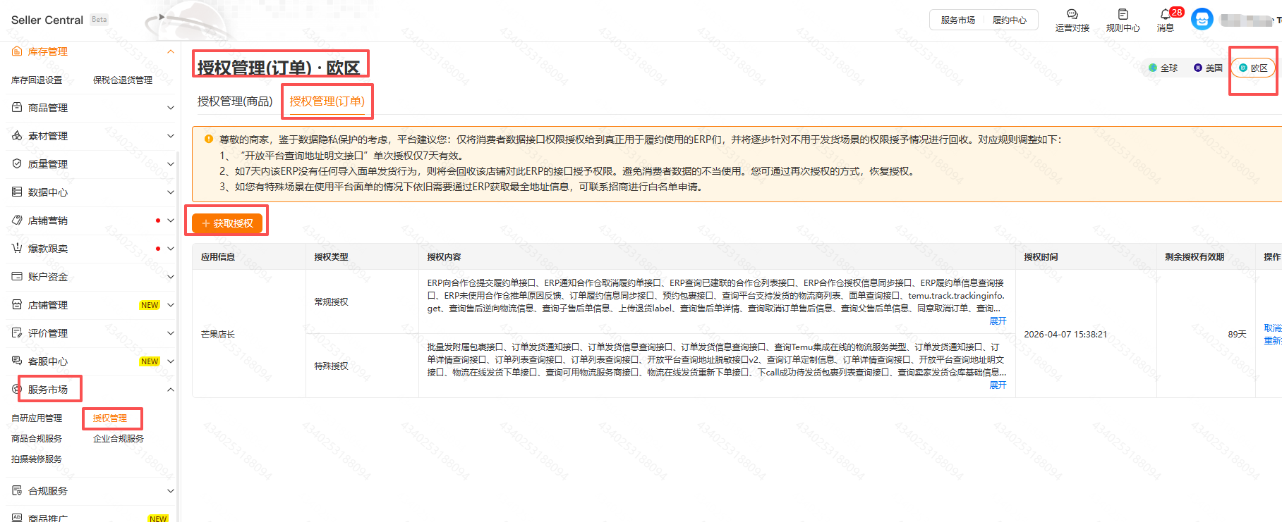 4.由于Temu接口限制,订单Token有7天时效。若授权后7天内未使用芒果erp处理订单,则订单Token会失效,需要更新授权。