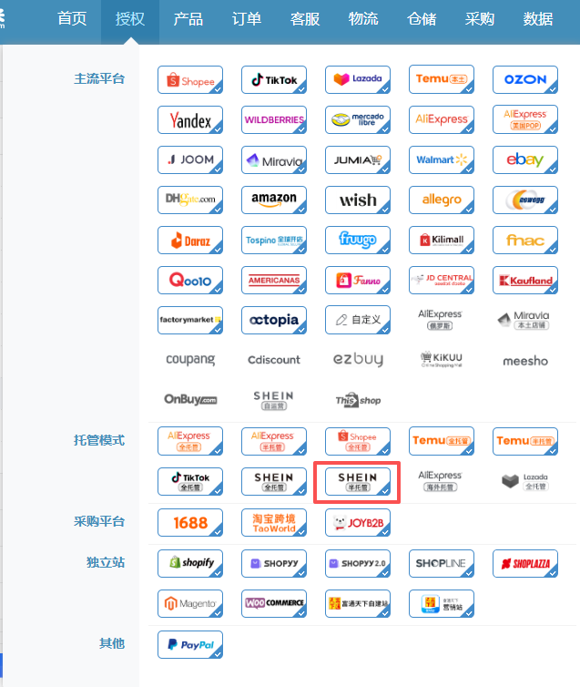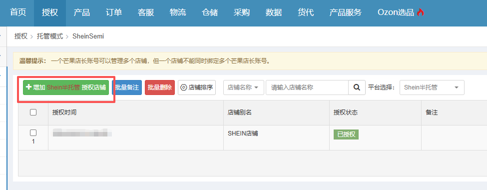 1、【授权】-【平台授权】,找到【shein半托管】,进行店铺绑定授权,如下图