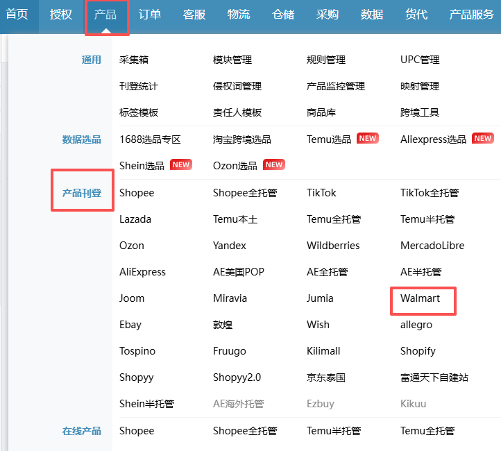 支持Walmart产品业务刊登,支持手动创建产品,也支持采集认领刊登。