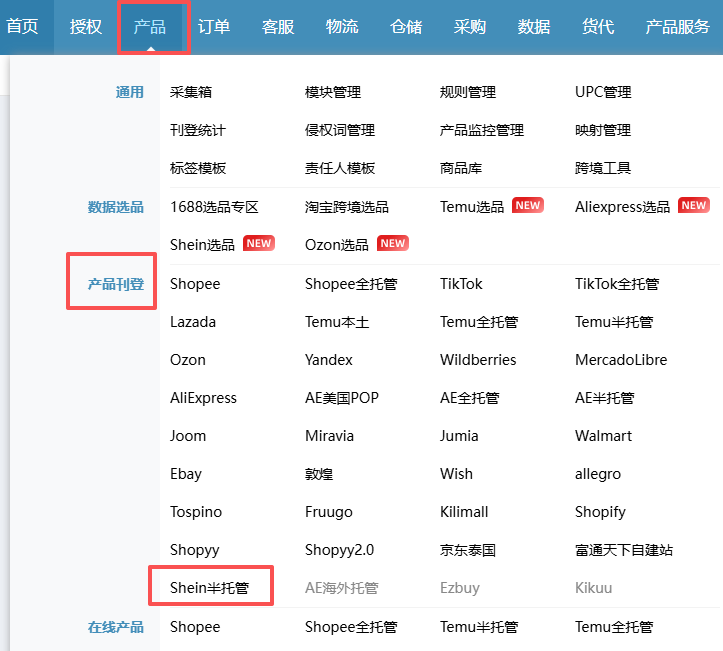 1、【产品】—>【产品刊登】—>【Shein半托管】,手动创建,填写好对应的产品信息数据,保存,发布即可。如下图