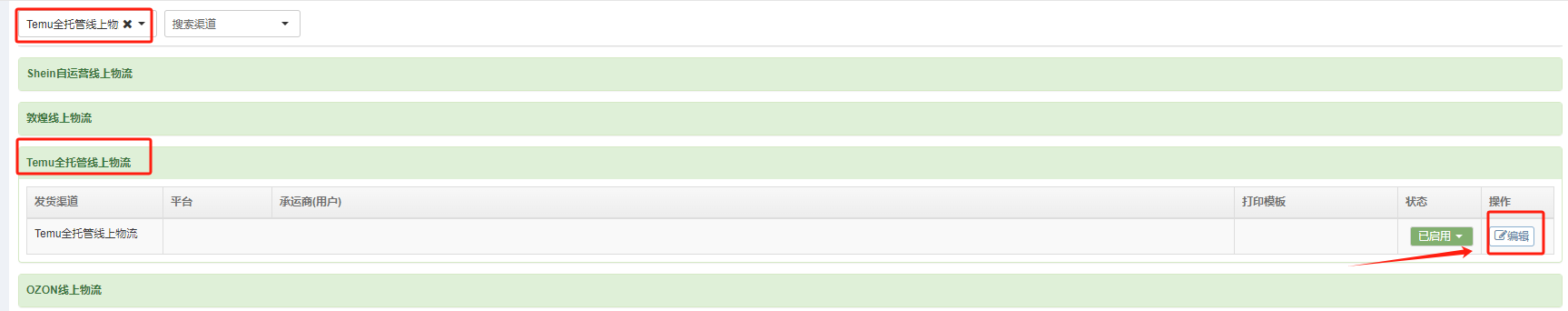 操作步骤: 第1步:在【物流】-【物流设置】-【系统对接货代】中找到temu全托管线上物流,如下图