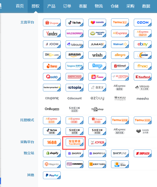 1、在芒果授权模块,点击【授权】-【采购平台】-【淘宝跨境(Taoworld)】进入授权页面,如下图