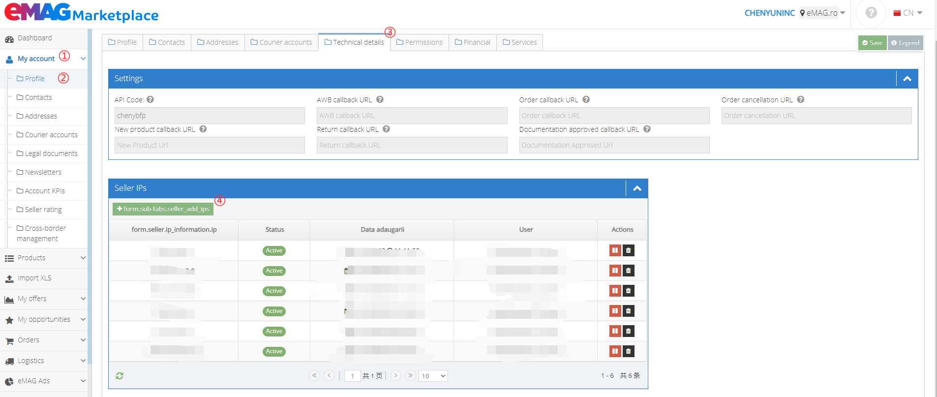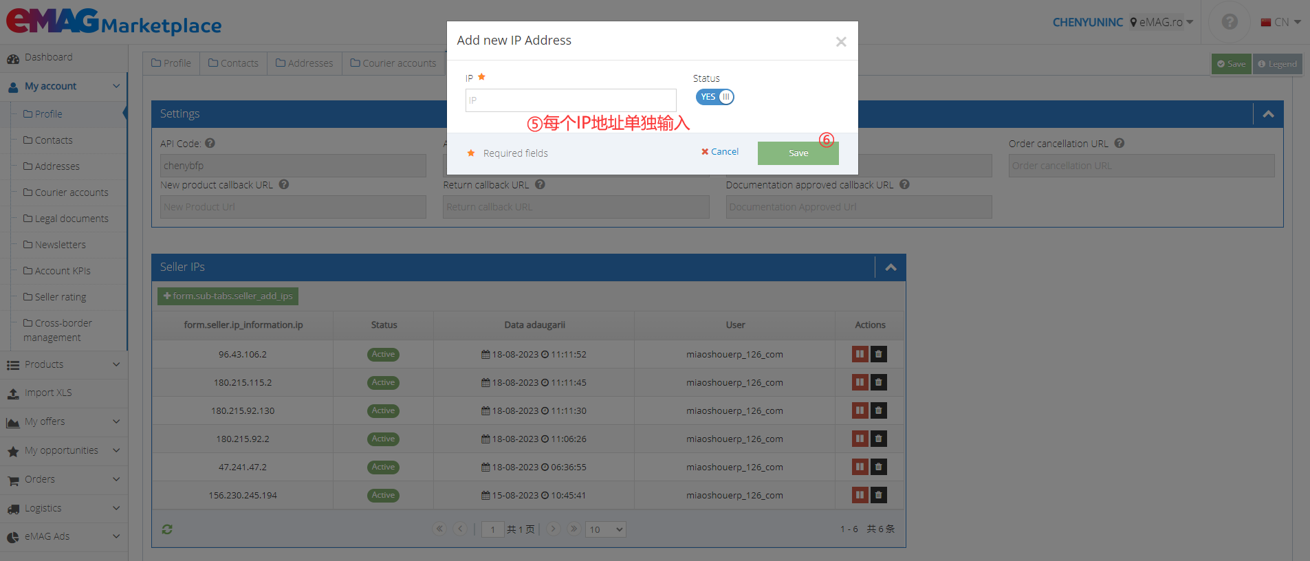 1、登录EMAG后台,点击进入【My account】>【Profile】>【Technical details】>【from sub tabs seller add lips】,在【Add new IP Address】弹窗中添加IP白名单,输入以下IP地址:(为方便后续使用,请添加下方全部IP地址!每个IP地址需要单独复制到选框中,再点击【save】即可)