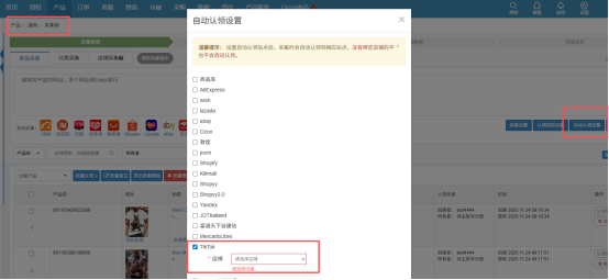 方式一:自动认领,可再采集箱-自动认领设置中找到产品需要自动认领的平台和店铺并勾选