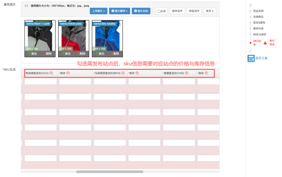 2.勾选需发布站点后,sku信息需要对应站点的价格与库存信息