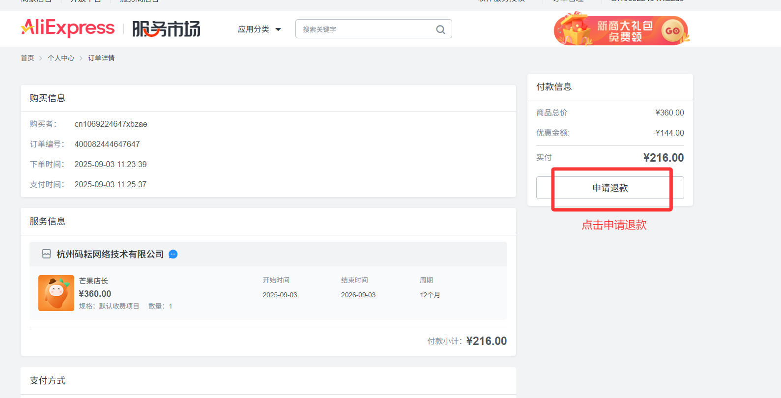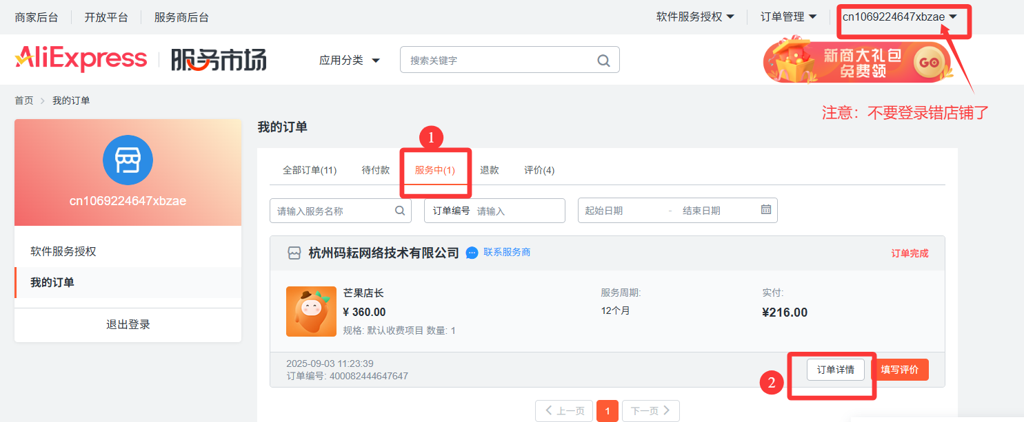 1、打开链接:https://marketplace.aliexpress.com/web/order/list.html 进入速卖通后台服务市场,找到【服务中】需要退款的订单,如下图