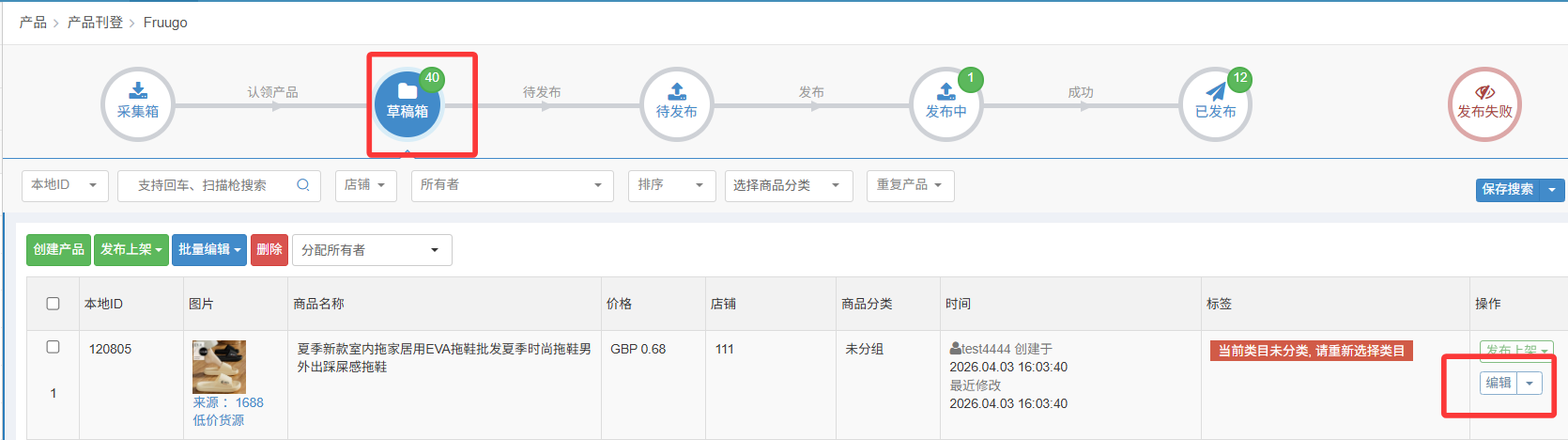 4、认领后进入fruugo草稿箱,对已认领的产品进行编辑修改