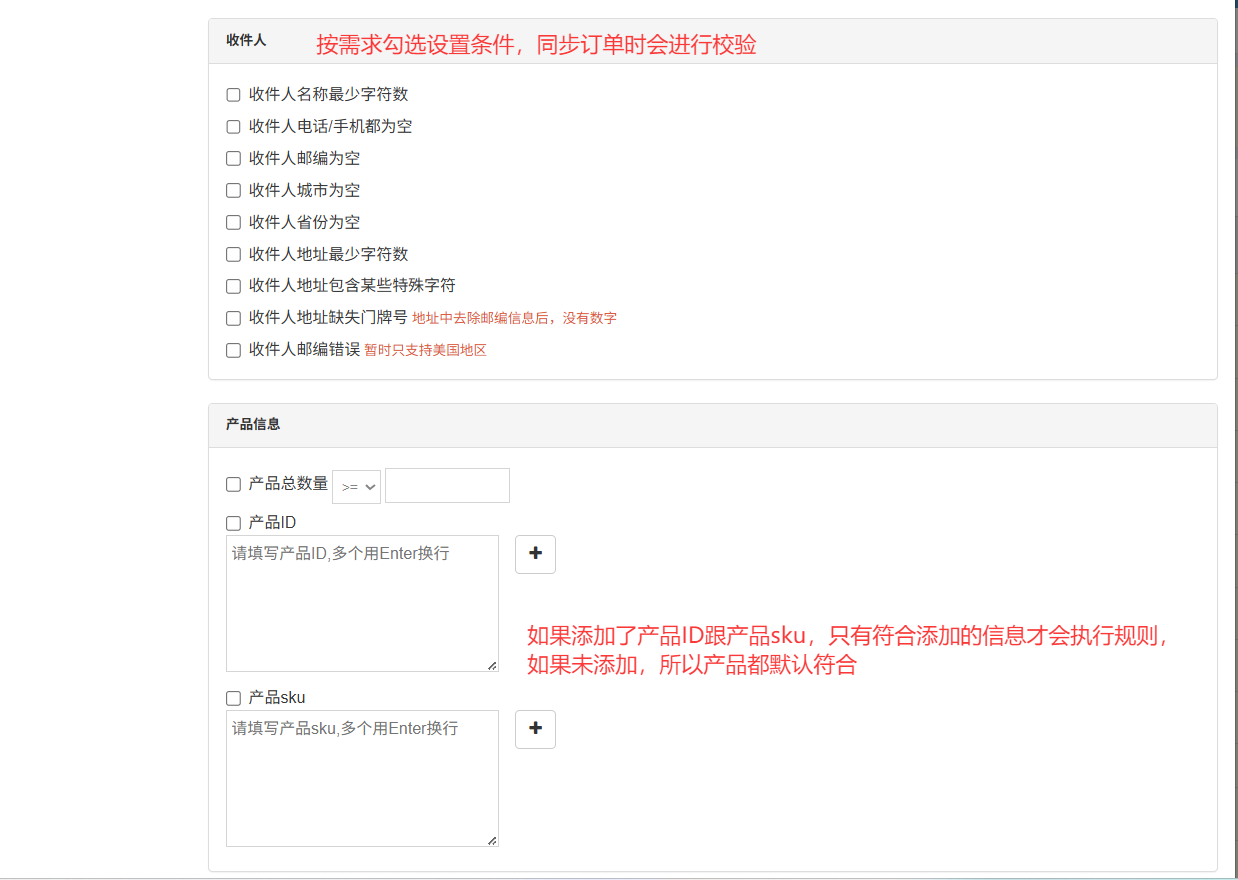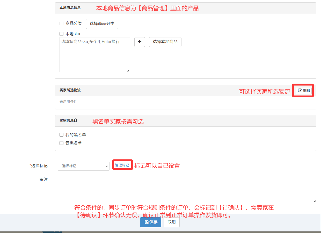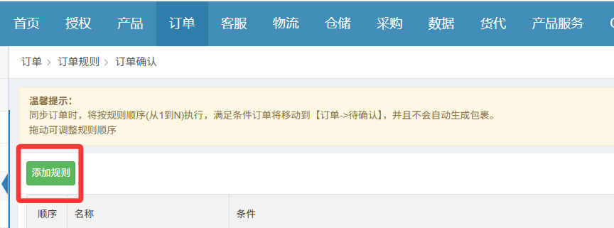 1.同步订单时,将按规则顺序(从1到N)执行,满足条件订单将移动到【订单->待确认】,并且不会自动生成包裹。
