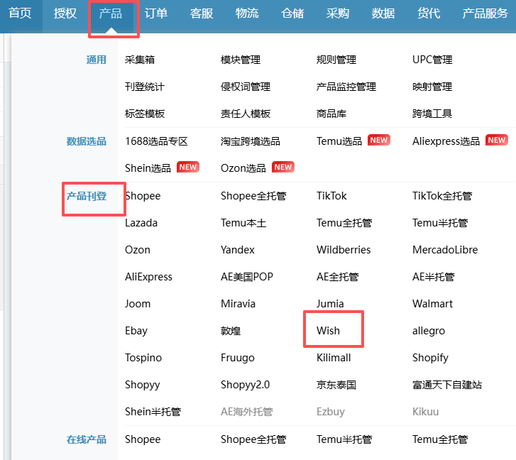 (4)进入草稿箱编辑刊登产品,鼠标悬停在【产品】上,【产品刊登】点击【wish】即可进入草稿箱,编辑产品。