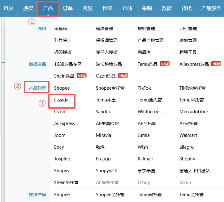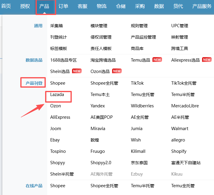 路径:【产品】->【产品刊登】->【Lazada】