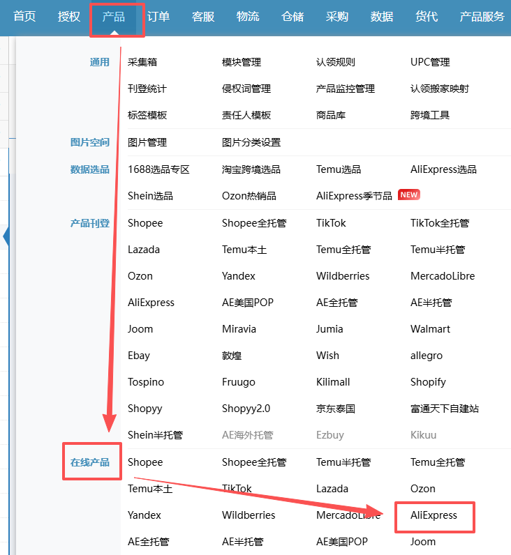 路径:【产品】-【在线产品】-【AliExpress】